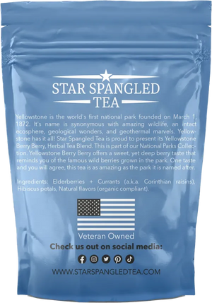 Yellowstone is the world’s first national park founded on March 1, 1872. Its name is synonymous with amazing wildlife, an intact ecosphere, geological wonders, and geothermal marvels. Yellowstone has it all! Star Spangled Tea is proud to present its Yellowstone Berry Berry Herbal Tea Blend. This is part of our National Parks Collection. Yellowstone Berry Berry offers a sweet, yet deep berry taste that reminds you of the famous wild berries grown in the park. One taste and you will agree, this tea is as amazing as the park it is named after.